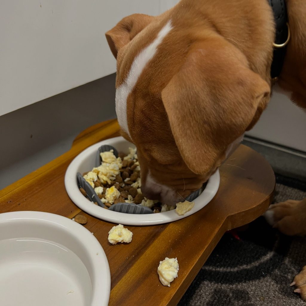 It seems to be Hectors go to breakfast, scrambled eggs. His day doesn’t start until he has had his eggs.