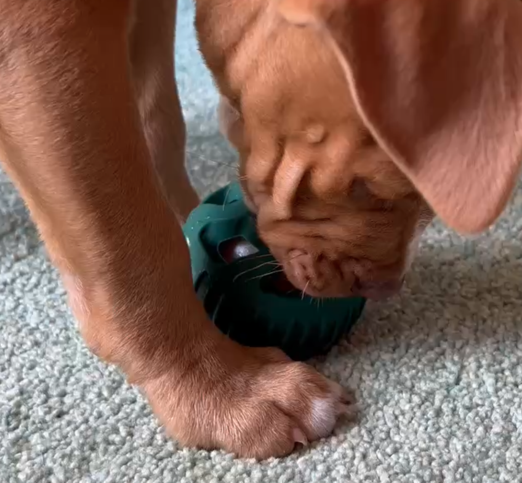 We tried Hector with a new toy that you put frozen treats into. This is a ball that contains chicken bone broth and some doggie biscuits. It certainly kept him quiet and cool for a while.