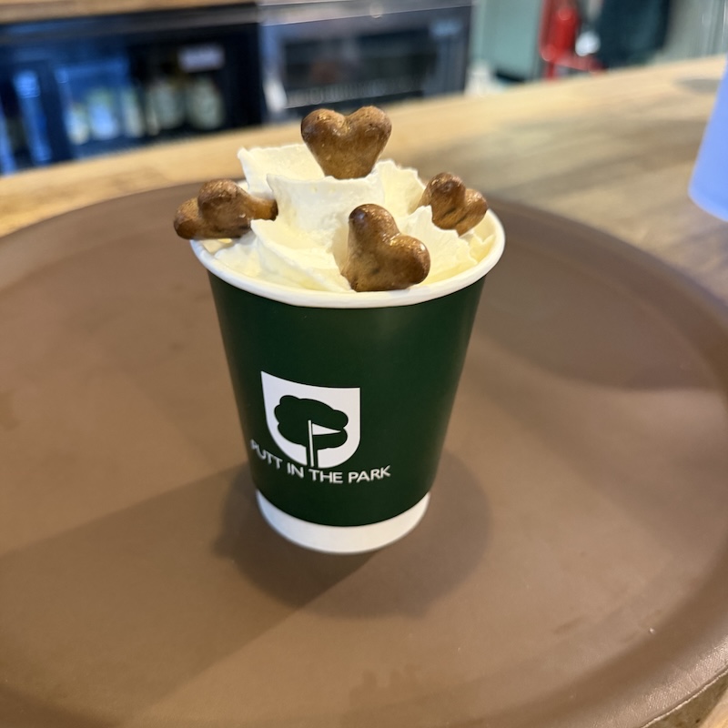 While Jezz and Wayne had a hot chocolate each, Hector had his first-ever Puppuccino at Putt In The Park café in Wandsworth Park.