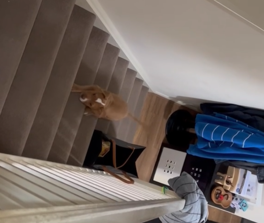And after installing the small steps for the sofa, Hector decides he has the confidence to tackle the staircase, and does so without a glitch. Cheeky f**ker. He does need to be carried back down, though. It goes like this: